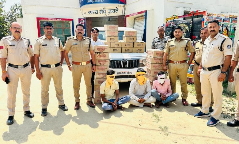 पुलिस अधीक्षक जिला मुरैना शैलेन्द्र सिंह चौहान द्वारा जिले में अवैध शराब / माद्यक पदार्थों की तस्करी करने वालों, विक्रय करने वालों एवं अवैध शराब का भण्डारण करने वालो के विरुद्ध प्रभावी कार्यवाही करने हेतु संपूर्ण मुरैना जिले में विशेष अभियान संचालित कराया जाकर जिले के समस्त थाना प्रभारिया को अवैध शराब के कारोबार में लिप्त व्यक्त्तियों के विरूद्ध प्रभावी कार्यवाही किये जाने हेतु निर्देशित किया गया। उक्त अभियान के तारतम्य में अतिरिक्त पुलिस अधीक्षक मुरैना डॉ. अरविन्द सिंह ठाकुर के निर्देशन एव अनुविभागीय अधिकारी (पुलिस) कैलारस रवि सोनेर के कुशल मार्गदर्शन में आज दिनांक 22.03.2024 कार्य. निरीक्षक शशिकुमार थाना प्रभारी चिन्नौनी का जरिए विश्वसनीय मुखबिर सूचना प्राप्त हुई कि शासकीय स्कूल भर्रा क पास तीन व्यक्ति एक बुलेरो गाड़ी में अवैध शराब रख हुए है एवं उक्त शराब को बेचने की फिराख में है। मुखबिर की उक्त सूचना की तस्दीक हेतु थाना प्रभारी द्वारा तत्काल मय हमराह फोर्स के मुखबिर द्वारा बताये गये स्थान पर पहुंचकर चैकिंग की गई, तो आरोपीगण द्वारा पुलिस को देखकर भागने का प्रयास किया गया, जिन्हे हमराह फोर्स की मदद से घेरकर पकड़ा गया एवं उक्त बुलेरो वाहन को चैक किया गया तो उसे 30 पेटी (270 बल्क लीटर) अवैध देशी शराब (प्लेन) रखी हुई मिली, आरोपियों से उक्त शराब के संबंध में वैध लायसेंस चाहा गया, तो लायसेंस नहीं होना बताया गया, आरोपीगण का उक्त कृत्य धारा 34 (2) आबकारी अधिनियम के अंतर्गत दंडनीय होने से मौके पर से उक्त अवैध शराब व बुलेरो गाडी को आरोपीगण के कब्जे से जप्त किया गया जिसकी अनुमानित कीमत करीबन कीमत 7 लाख 10 हजार रूपये है। तदोपरांत थाना वापसी पर आरोपीगण के विरूद्ध अपराध क्रमांक 37/2024 धारा 34(2) आबकारी अधिनियम के अंतर्गत कायम कर विवेचना में लिया गया।