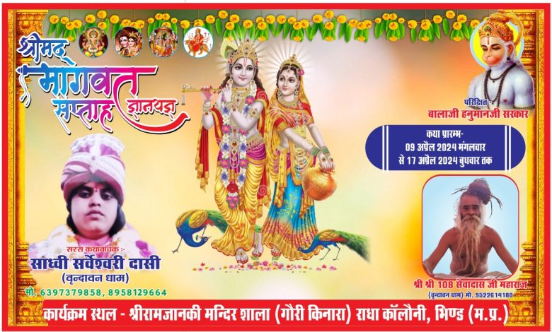 भिंडी ऋषि की पावन धरा पर श्री राम जानकी मंदिर शाला गौरी का किनारा अर्धनारीश्वर मंदिर के पास, नवरात्रि के पावन अवसर पर श्रीमद् भागवत कथा ज्ञान यज्ञ का शुभ मंगल आयोजन का कार्यक्रम दिनांक 9 अप्रैल 2024 मंगलवार से 17 अप्रैल 2024 बुधवार तक रखा गया है, उक्त श्रीमद् भागवत कथा ज्ञान यज्ञ के आयोजन महान तपस्वी संत श्री श्री 108 सेवक दास जी महाराज की विशेष अनुकंपा और आशीर्वाद से किया जा रहा है उक्त भागवत कथा का वाचन महान तपस्वी संत श्री धाम वृंदावन से पधारे परम पूज्य अंतरराष्ट्रीय भागवत आचार्य साध्वी सर्वेश्वरी दासी के मुखारविंद से किया जा रहा है,