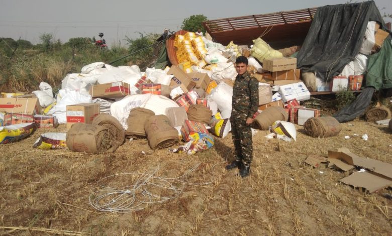 भिंड जिले के लहार थाना क्षेत्र में MP7GA 3709 ट्रक जय भोले ट्रांसपोर्ट ग्वालियर से परचूनी और इलेक्ट्रॉनिक सामन भरकर आ रहा था लहार आज सुबह की रात ड्राइवर की नींद लगने से लहार मिहोना रोड वनखण्डेश्वर मंदिर के पास पलटा जिससे इलेक्ट्रॉनिक सामान चारो ओर बिखर गया सूचना पर मौके पर थाना प्रभारी लहार रविंद्र शर्मा द्वारा उप निरीक्षक सुरेश दत मिश्रा आर श्याम गुर्जर, लाखन सिंह को भेजा गया जिनके द्वारा सामान को मालिक आने तक सुरक्षित रखा गया ।