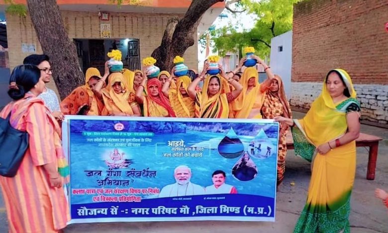 जल गंगा संवर्धन अभियान के तहत् नगर परिषद मौ में निकाली गई कलश यात्रा।