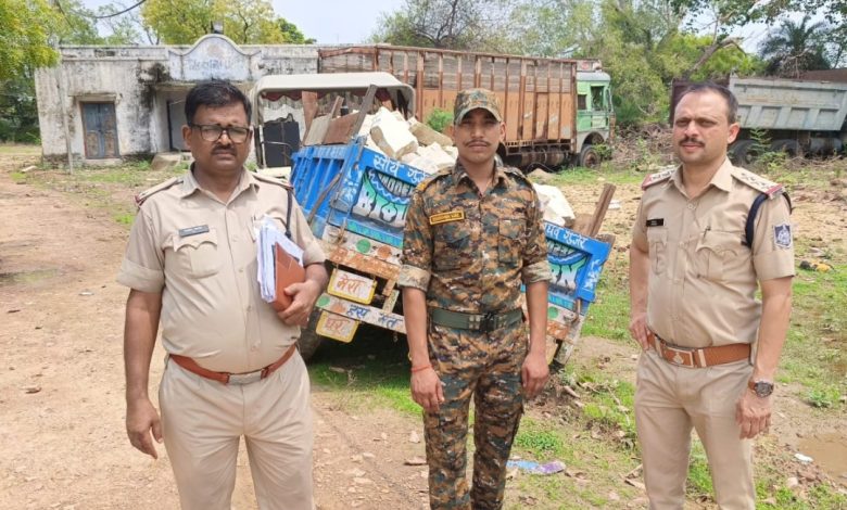 पुलिस अधीक्षक जिला मुरैना शैलेन्द्र सिंह चौहान द्वारा जिले में रेत व पत्थर का अवैध रूप से परिवहन, उत्त्खनन एवं भण्डारण करने वालों के विरूद्ध प्रभावी कार्यवाही करने हेतु संपूर्ण मुरैना जिले में विशेष अभियान संचालित कराया जाकर जिला मुरैना के समस्त राजपत्रित अधिकारीगण (पुलिस) एवं थाना प्रभारियों को चंबल नदी के अवैध रेत/पत्थर परिवहन / उत्खनन/भण्डारण के विरूद्ध प्रभावी कार्यवाही किये जाने हेतु निर्देशित किया गया। उक्त अभियान के तारतम्य में अतिरिक्त पुलिस अधीक्षक मुरैना डॉ. अरविन्द सिंह ठाकुर के निर्देशन एवं एसडीओपी आदर्शकांत शुक्ला (भापुसे) के कुशल मार्गदर्शन में निरीक्षक जितेन्द्र कुमार दौहरे थाना प्रभारी रिठौरा को आज दिनांक 28.06.24 को जरिये मुखबिर सूचना मिली की ग्राम पढ़ावली गढ़ी पर से ट्रेक्टर के माध्यम से खण्डो का अवैध परिवहन किया जा रहा उक्त सूचना पर कार्यवाही करते हुए थाना प्रभारी रिठौराकलां द्वारा मय हमराह टीम के मुखबिर द्वारा बताये स्थान पर पहुंचे तो सामने से एक टैक्टर नीले रंग का नम्बर का स्वराज टैक्टर आता दिखा जो पुलिस को देखकर भागने का प्रयास करने लगा जिसे हमराह फोर्स की मदद से घेर कर पकड़ा गया एवं उक्त ट्रेक्टर मे लगी ट्राली से भरे सफेद खण्डो को मौके से धारा 379,414 भादवि, 21(1), 4 (1) खान एवं खनिज (विकाश का विनयमन) अधिनियम 1957 के तहत जप्त कर अपराध पंजीबद्ध कर विवेचना में लिया गया।
