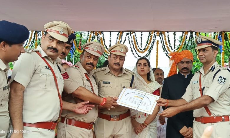 भिंड पुलिस ग्राउंड में स्वतंत्रता दिवस के अवसर पर कलेक्टर संजीव श्रीवास्तव , पुलिस अधीक्षक डॉ असित यादव के द्वारा एसडीओपी लहार प्रवीण त्रिपाठी के नेतृत्व में लूटों का खुलासा कर अंतरराज्यीय गैंग को पकड़ने वाली टीम थाना प्रभारी लहार निरीक्षक रविंद्र शर्मा एवं थाना प्रभारी गोरमी उप निरीक्षक ध्यानेंद्र यादव तथा उनकी टीम को सम्मानित किया गया।