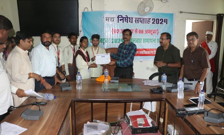 कलेक्टर संजीव श्रीवास्तव की अध्यक्षता में सामाजिक न्याय एवं दिव्यांगजन सशक्तिकरण विभाग के नशा मुक्त भारत अभियान अंतर्गत 02 से 08 अक्टूबर 2024 मध निषेध सप्ताह का समापन कार्यक्रम जिला कलेक्टर सभागार में संपन्न हुआ। जिसमें जिले में विगत आठ दिवस में आयोजित नशाबंदी प्रतियोगता में भाग लेने वाले छात्रों को कलेक्टर द्वारा सम्मानित किया गया।