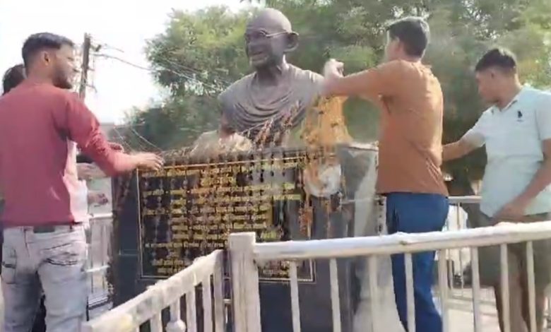कांग्रेस प्रदेश सचिव प्रमोद चौधरी (धनु ) के समर्थकों कने की गाँधी प्रतिमा की साफ सफाई।