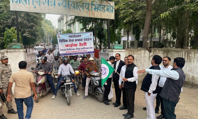 इसी क्रम में जिला मुख्यालय स्तर पर बाईक रैली के माध्यम से न्यायोत्सवः विधिक सेवा सप्ताह कार्यक्रम का शुभारंभ मनोज कुमार तिवारी, (सीनि.) विशेष न्यायाधीश, भिण्ड द्वारा रैली को हरी झण्डी दिखाकर किया गया। उक्त रैली का उद्देश्य आमजनों में विधिक सेवा संस्थानों द्वारा संचालित की जा रही विभिन्न योजनाओं के संबंध में जागरूकता प्रसारित करना था जिससे वह उक्त योजनाओं के बारें में जागरूक बने तथा अपने अधिकारों के प्रति जागरूकता प्रदर्शित करते हुए एक सशक्त नागरिक की भूमिका समाज में अदा कर सकें।