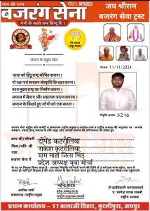 बजरंग सेना के राष्ट्रीय अध्यक्ष गौ क्रांतिकारी भागवताचार्य पूज्य भागेंद्र व्यास शास्त्री, बजरंग सेना के राष्ट्रीय प्रमुख अशोक शर्मा और बजरंग सेना के प्रदेश अध्यक्ष महेंद्र यादव की अनुशंसा पर बजरंग सेना के प्रदेश महामंत्री दीपेंद्र कटरौलिया के सराहनीय कार्य को देखते हुए उनको मध्य प्रदेश युवा मोर्चा बजरंग सेना का प्रदेश अध्यक्ष नियुक्त किया जाता है।