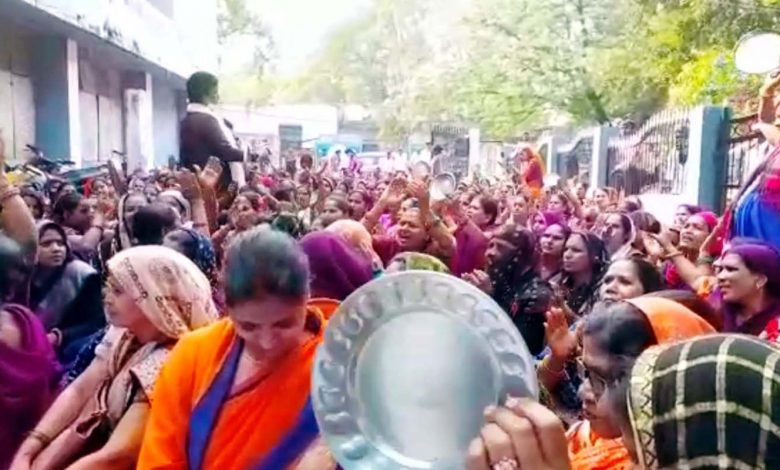 आशा-ऊषा कार्यकर्ताओं ने थाली बजाकर किया विरोध प्रदर्शन