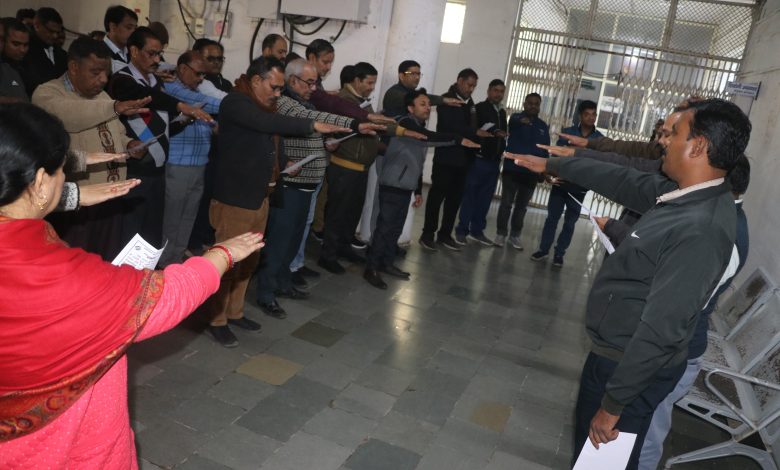 अपर कलेक्टर एवं उप जिला निर्वाचन अधिकारी एल.के. पाण्डेय द्वारा उपस्थित सभी अधिकारियों/कर्मचारियों को ’’हम, भारत के नागरिक, लोकतंत्र में अपनी पूर्ण आस्था रखते हुए यह शपथ लेते हैं कि हम अपने देश की लोकतांत्रिक परम्पराओं की मर्यादा को बनाए रखेंगे तथा स्वतंत्र, निष्पक्ष एवं शांतिपूर्ण निर्वाचन की गरिमा को अक्षुण्ण रखते हुए, निर्भीक होकर, धर्म, वर्ग, जाति, समुदाय, भाषा अथवा अन्य किसी भी प्रलोभन से प्रभावित हुए बिना सभी निर्वाचनों में अपनें मताधिकार का प्रयोग करेंगे’’शपथ दिलाई गई।