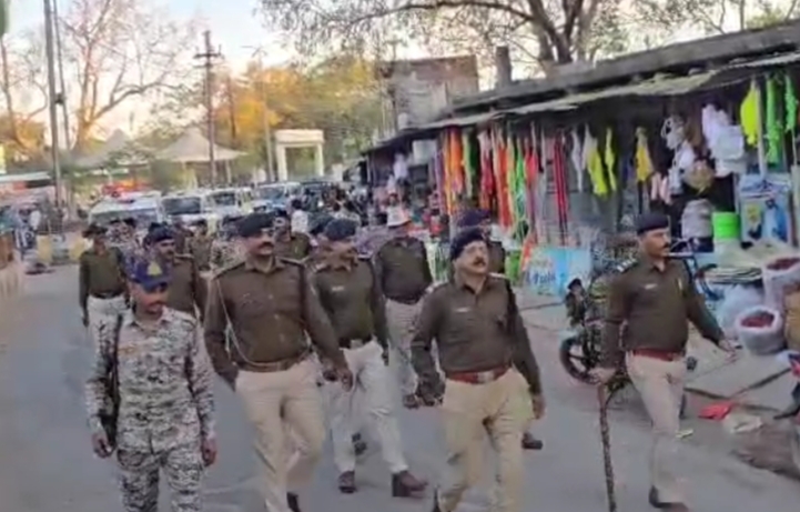 वरिष्ठ पुलिस अधिकारियों के निर्देशन में पुलिस ने निकाला फ्लेग मार्च।