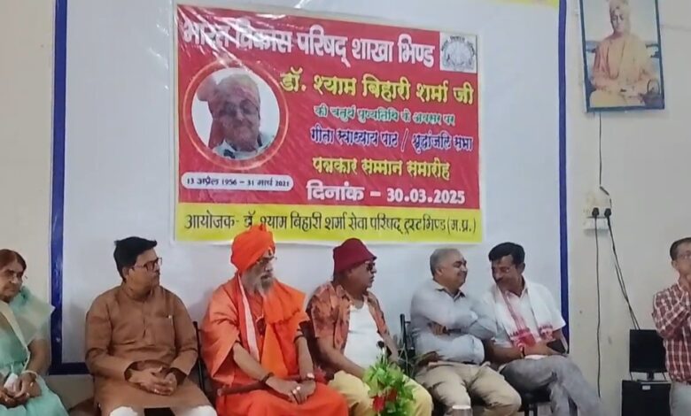 डॉ.श्याम बिहारी शर्मा का जीवन सेवा में समर्पित लोगो के लिए प्रेरणा स्रोत है – देवश्री माली भिंड में डॉ.श्याम बिहारी शर्मा जी की चतुर्थ पुण्यतिथि के अवसर पर भारत विकास परिषद, शाखा भिंड द्वारा सरस्वती शिशु मंदिर विध्यालय, भिंड में नववर्ष, गुड़ी पड़वा एवं चैत्र नवरात्र पर्व पर गीता स्वाध्याय पाठ, पुष्पांजलि, पत्रकार सम्मान कार्यक्रम आयोजित किया गया। कार्यक्रम का आयोजन डॉ.श्याम बिहारी शर्मा सेवा परिषद ट्रस्ट के सौजन्य से किया गया।