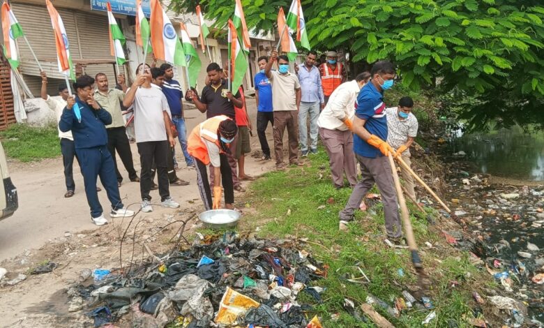 इसी क्रम में आज आज कलेक्टर संजीव श्रीवास्तव एवं नगर पालिका परिषद भिण्ड द्वारा तिरंगा यात्रा एवं स्वच्छता श्रमदान कार्यक्रम का आयोजन इंदिरा गांधी चौराहा नाले पर किया गया।