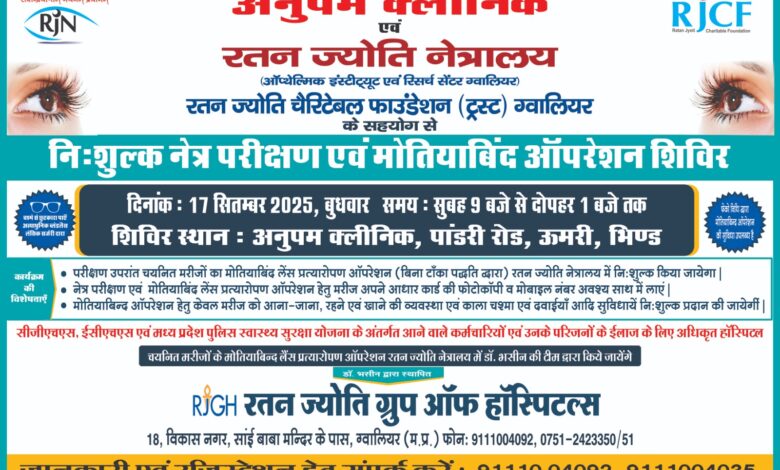 रतन ज्योति नेत्रालय (ऑप्थेल्मिक इंस्टीट्यूट एवं रिसर्च सेंटर ग्वालियर) रतन ज्योति चैरिटेबल फाउंडेशन (ट्रस्ट) ग्वालियर के सहयोग से निःशुल्क नेत्र परीक्षण एवं मोतियाबिंद ऑपरेशन शिविर दिनांक : 17 सितम्बर 2025, बुधवार समय सुबह 9 बजे से दोपहर 1 बजे तक शिविर स्थान : अनुपम क्लीनिक, पांडरी रोड, ऊमरी, भिण्ड।