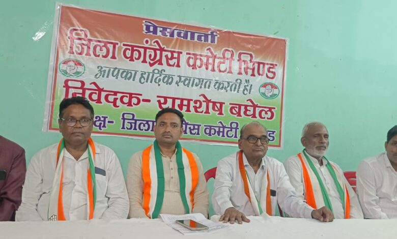 भिण्ड । सर्किट हाउस के पास मयूर पैलेस भिण्ड में आयोजिन पत्रकार वार्ता में बोलते हुये जिला काँग्रेस कमेटी ग्रामीण के अध्यक्ष रामशेष बघेल ने बताया है,कि भाजपा की डबल इंजन सरकार जनहित के प्रत्येक मोर्च पर असफल रही है, भाजपा शाम-दाम,दण्ड भेद की नीति से सत्ता में बने रहना चाहती है,जन समस्याओ के निराकरण में कोई रूचि नही है। रामशेष बघेल ने कहा कि भाजपा शासन में मँहगाई की मार से आमजनता और बेरोजगारी से नोजवान परेशान है। कॉग्रेस के शासन में प्रतिवर्ष सेना,पुलिस, शिक्षिक एवं अन्य विभागो में भर्ती के लिये वैकेन्सी निकाली जाती थी भाजपा शासन ने बंद कर दी है। अग्निवीर योजना को बंद कर पुराने तरीके से सेना में भर्ती प्रारंभ करने की जिला काँग्रेस कमेटी मांग करती है । उन्होंने कहा कि कर्मचारियो को पुरानी पेंशन दिलाया जाना प्रारंभ की जाये ।