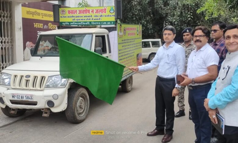 कलेक्टर भिण्ड द्वारा नरवाई (पराली) प्रबंधन जागरूकता हेतु प्रचार रथ को कलेक्ट्रेट परिसर से हरी झण्डी दिखाकर रवाना किया गया। यह प्रचार रथ भिण्ड जिले के समस्त 06 विकासखण्डों में पूरे नबम्बर माह तक भ्रमण करेगा।