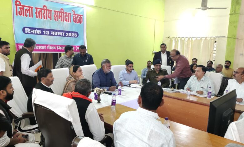 जिले के प्रभारी मंत्री तथा मध्य प्रदेश शासन के पंचायत एवं ग्रामीण विकास, श्रम मंत्री प्रहलाद पटेल की अध्यक्षता में जिला स्तरीय समीक्षा बैठक जनपद पंचायत सभागार गोहद में आयोजित की गई। इस दौरान विधायक गोहद केशव देसाई, जिला पंचायत अध्यक्ष कामना सिंह भदौरिया, भाजपा जिला अध्यक्ष देवेन्द्र सिंह नरवरिया, कलेक्टर किरोड़ी लाल मीना, पुलिस अधीक्षक डॉ असित यादव, सीईओ जिला पंचायत सुनील दुबे, एडीएम एल.के. पाण्डेय सहित अन्य अधिकारी, जनप्रतिनिधिगण उपस्थित रहे।