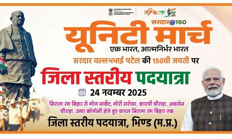 युवा कार्यक्रम एवं खेल मंत्रालय भारत सरकार मेरा युवा भारत भिंड एवं जिला प्रशासन के सयुंक्त तत्वधान में सरदार वल्लभभाई पटेल की 150वीं जयंती के उपलक्ष्य में जिला भिंड में दिनांक 24 नवम्बर 2025 को प्रातः 09:00 बजे “एकता पदयात्रा” का भव्य आयोजन किया जा रहा है। राष्ट्रीय एकता, सद्भावना और जनजागरण को समर्पित इस कार्यक्रम में बड़ी संख्या में नागरिक, छात्र, युवा संगठन, एनएसएस, एनसीसी तथा स्काउट–गाइड की टुकड़ियाँ शामिल होंगी। इस अवसर पर सांसद संध्या राय, विधायक भिण्ड नरेंद्र सिंह कुशवाह तथा जिला प्रशासन के अधिकारीगण विशेष अतिथि के रूप में उपस्थित रहेंगे और पदयात्रा को हरी झंडी दिखाकर रवाना करेंगे।