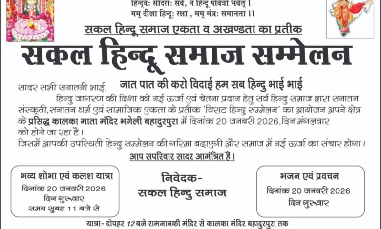 सकल हिन्दू समाज सम्मेलन कालका मंदिर बघेली बहादुरपुरा में 20 जनवरी को।