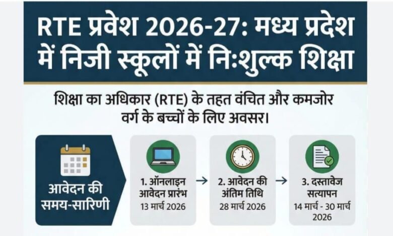 शिक्षा का अधिकार (आर.टी.ई.) अधिनियम के अंतर्गत सत्र 2026-27 में निजी स्कूलों की प्रथम प्रवेशित कक्षा में निःशुल्क प्रवेश के लिए ऑनलाइन आवेदन 13 मार्च 2026 से प्रारंभ होंगे। ऑनलाइन आवेदन की अंतिम तिथि 28 मार्च 2026 निर्धारित की गई है। आर.टी.ई पोर्टल www.rteportal.mp.gov.in पर ऑनलाइन आवेदन पत्र का प्रारूप एवं निर्देश उपलब्ध कराये गए हैं। निजी विद्यालय में निःशुल्क प्रवेश के लिए आवेदकों का चयन, ऑनलाइन लॉटरी के माध्यम से 2 अप्रैल 2026 को किया जायेगा।