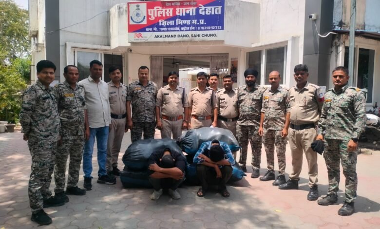 जिसके कम में पुलिस उपमहानिरीक्षक / पुलिस अधीक्षक भिण्ड डॉ० असित यादव एवं अतिरिक्त पुलिस अधीक्षक भिण्ड संजीव पाठक के निर्देशन में अवैध मादक पदार्थों की धरपकड हेतु समस्त राजपत्रित अधिकारी एवं समस्त थाना प्रभारियो को मुखबिर तन्त्र विकसित करने के लिये निर्देर्शित किया गया था। इसी तारतम्य में नगर पुलिस अधीक्षक निरंजन राजपूत के मार्गदर्शन में थाना प्रभारी देहात निरीक्षक मुकेश शाक्य दिनांक 17.04.26 को प्राप्त मुखबिर सूचना के आधार पर प्रज्ञानगर कुम्हरौआ भिण्ड से दो तस्करों को गाजा सप्लाई करने के सम्बन्ध में सूचना मिली। उक्त सूचना के आधार पर पुलिस फोर्स द्वारा घेराबन्दी कर दबिश देकर दो आरोपीगणों को गांजे से भरे चार बोरा सहित पकडा गया आरोपियों से चारों बोरियों में रखे 1 किलो के कुल 138 पैकेट वजन 138 किलोग्राम कीमती करीब 28 लाख रूपये के जप्त कर थाना देहात में अपराध क0 233/26 धारा 8/20 एनडीपीएस का अपराध पंजीबद्ध कर विवेचना में लिया गया है।उक्त अपराध के सम्बन्ध में गिर० किए गए आरोपीगणों से बारीकी से पूछताछ की गयी तो उनके द्वारा अपने तीन अन्य साथियों के साथ गांजा तस्करी करना बताया गया अन्य साथियों के बारे में जानकारी प्राप्त की जा रही है। तथा आरोपीगणों से गांजा लाने के स्त्रोतों को ज्ञात किया जा रहा है।उक्त घटना के सम्बन्ध में आरोपियों द्वारा बताया गया कि आरोपी माल उडीसा से लेकर आते थे माल की विकय करने हेतु आरोपियों ने एक मकान कुम्रौआ में किराये पर ले रखा था जहाँ पर पूरा माल रखते थे और वही से माल सप्लाई किया जाता था पूर्व में भी इनके द्वारा गांजा लाकर इसी मकान से सप्लाई किया जा चुका है इस बार पुलिस को मुखबिर द्वारा सूचना प्राप्त हो गई जिसके कारण इतने अवैध मादक पदार्थ की बड़ी खेप पकडनें में सफलता प्राप्त हुई है। न्यायालय पेश कर पीआर पर लेकर आरोपियों से अवैध मादक पदार्थ के सम्बन्ध में बारीकी से पूछताछ की जा रही है जिसमें अवैध मादक पदार्थ खरीदने वाले एवं बैचने वालो को भी आरोपी बनाया गया है तथा पूछताछ में बताए गए व्यक्तियों पर भी वैधानिक कार्यवाही की जावेगी जिसमें और भी खुलाशें होने की सम्भावना है। मुख्य सराहनीय भूमिका निरीक्षक शिवप्रताप सिह राजावत. निरी मुकेश शाक्य, उ०नि० अतुल भदौरिया, उ०नि० वैभव तोमर, उनि बलराम यादव, उनि विजय शिवहरे, सउनि सत्यवीर सिहं, प्रआर० प्रमोद पाराशर, प्रआर० महेश कुमार, प्रआर० रातेन्द्र यादव, प्रआर० त्रिवेन्द्र सिंह, प्रआर गुरुदास सोही, आर०आनन्द दीक्षित, आर० राहुल यादव, आर० विकास चौहान, आर० अभिषेक यादव, आर० दीपक राजावत,आर सरजीत सिंह, प्रदीप यादव, भूपेन्द्र तोमर, दिलीप सिंह, ज्ञानेन्द्र मिश्रा, अजय भदौरिया की मुख्य