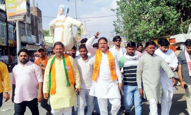 भाजयुमो ने 26 मण्डलों में जलाए नेता प्रतिपक्ष डॉ. सिंह के पुतले