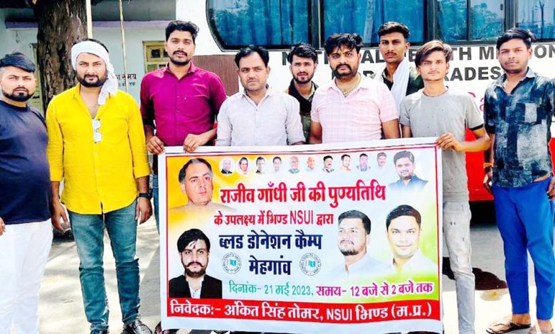 मेहगांव। भारत के पूर्व प्रधानमंत्री राजीव गांधी की पुण्यतिथि पर एनएसयूआई जिलाध्यक्ष अंकित तोमर के नेतृत्व में शा. अस्पताल मेहगांव में रक्तदान शिविर लगाया गया। जहां एनएसयूआई कार्यकर्ताओं ने रक्तदान कर व दो मिनट का मौन धारण करके उनको याद किया।