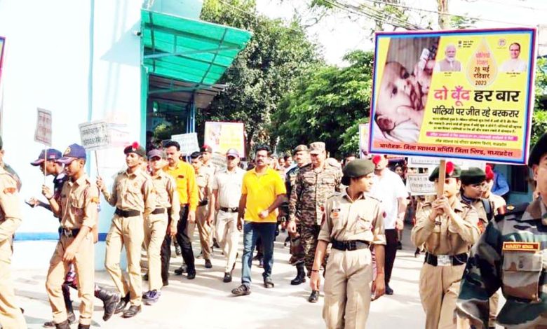 भिण्ड। पल्स पोलियो अभियान अंतर्गत शून्य से पांच वर्ष तक कोई भी बच्चा पोलियो की खुराब से वंचित न रहे। इस हेतु 28 मई को आयोजित पल्स पोलियो अभियान के सफल संचालन हेतु शनिवार को शहर में एनसीसी केडेट्स व जन अभियान परिषद द्वारा विशाल रैली का आयोजन किया गया। पल्स पोलियो जन जागरुकता रैली को कलेक्टर डॉ. सतीश कुमार एस, एनसीसी कमाण्डेंट कर्नल जगदीश राव एवं मुख्य चिकित्सा एवं स्वास्थ्य अधिकारी डॉ. यूपीएस कुशवाह ने हरी झण्डी दिखाकर रवाना किया।