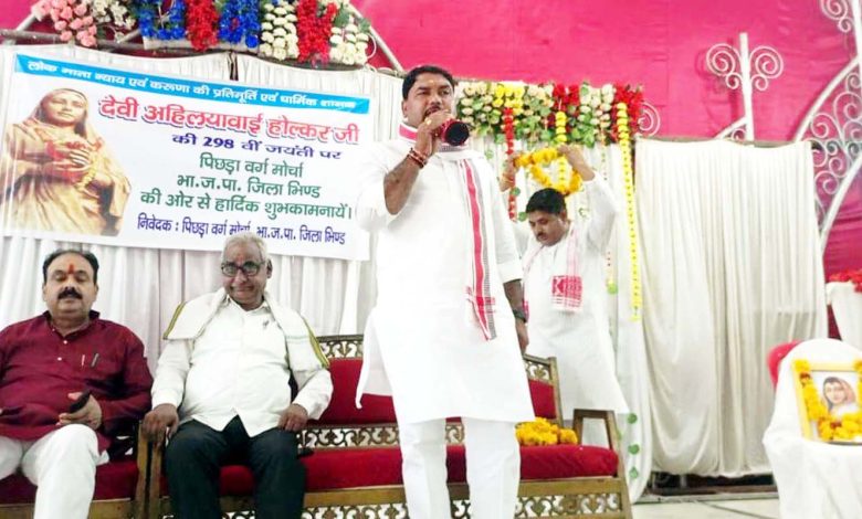 भिण्ड। लोकमाता अहिल्याबाई होल्कर ने सामाजिक समरसता एवं भाईचारा तथा अपने व्यक्तित्व और कृतित्व से समाज के अंतिम छोर तक के व्यक्ति को अपने विचारों के साथ प्रेरणा दी। यह उद्गार भारतीय जनता पार्टी पिछड़ा वर्ग मोर्चा के पूर्व जिलाध्यक्ष एवं विधानसभा संयोजक अमृतपाल सिंह बघेल एडवोकेट ने शिव उत्सव मंगल भवन में पिछड़ा वर्ग मोर्चा द्वारा आयोजित जयंती समारोह में मुख्य अतिथि की आसंदी व्यक्त किए। कार्यक्रम की अध्यक्षता जिलाध्यक्ष धर्मेन्द्र सिंह गुर्जर ने की।