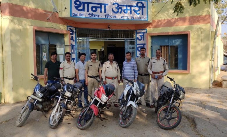 भिंड पुलिस कप्तान शैलेंद्र सिंह चौहान की कुशल नेतृत्व में उनकी जांबाज ऊमरी पुलिस की नयागांव पुलिस के सहयोग से बड़ी कार्रवाई, 5 बाइक सहित दो बाइक चोरों को पकड़ा।आरोपियों का नेटवर्क मध्य प्रदेश के अलावा उत्तर प्रदेश व अन्य प्रांतों से भी जुड़ा था।