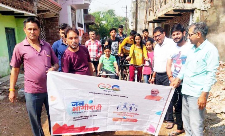 भिण्ड। कौशल विकास एवं उद्यमिता मंत्रालय भारत सरकार द्वारा प्रायोजित कार्यक्रम जी20 सम्मेलन के उपलक्ष्य में जन शिक्षण संस्थान भिण्ड के तत्वावधान में जन भागीदारी कार्यक्रम के अंतर्गत साइकिल रैली का आयोजन अटेर रोड से संतोषी माता मन्दिर से लश्कर रोड तक किया गया। कार्यक्रम में मुख्य अतिथि समाजसेवी व पूर्व सरपंच रविन्द्र शर्मा उपस्थित रहे। साइकिल रैली में कंप्यूटर प्रशिक्षण केन्द्र अटेर रोड तथा लश्कर रोड केन्द्र के लगभग 30 लाभार्थियों ने प्रतिभाग किया तथा कार्यक्रम में वंदे मातरम, भारत माता की जय एवं स्वच्छता का संदेश, पौधारोपण के फायदे आदि के नारे बोलकर साइकिल रैली गली-मोहल्ले से निकालकर कंप्यूटर प्रशिक्षण केन्द्र लश्कर रोड पर समापन हुई।