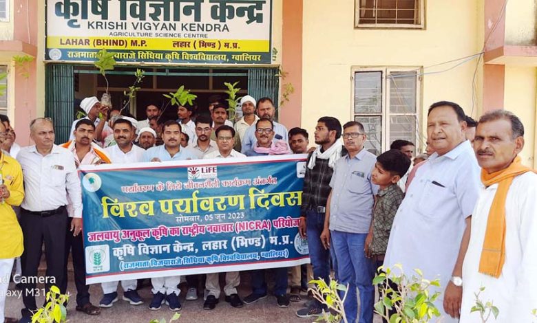 भिण्ड। पर्यावरण के लिए जीवनशैली कार्यक्रम के क्रम में कृषि विज्ञान केन्द्र पर विश्व पर्यावरण दिवस का आयोजन किया गया। इस अवसर पर वैज्ञानिकों ने किसानों को कृषि में पर्यावरण की उपयोगिता एवं उसके महत्व पर विस्तार से जानकारी दी। साथ ही किसानों को अमरूद के एक-एक पौधे एवं सब्जी सीट किट प्रदान की गई।