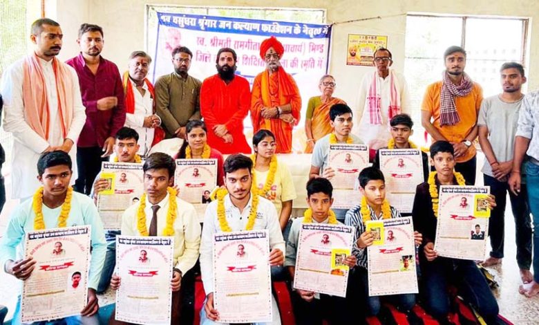 भिण्ड। नव वसुंधरा श्रृंगार जनकल्याण फाउण्डेशन के नेतृत्व में भिण्ड जिले की पहली शिक्षित महिला सेवानिवृत्त प्राचार्य स्व. रामगीता शर्मा की स्मृति में अद्र्धनारीश्वर मन्दिर गौरी के किनारे प्रतिभा सम्मान का आयोजन किया गया। सर्वप्रथम मां वीणा वादिनी के चित्र पर माल्यार्पण और स्व. रामगीता शर्मा को श्रृद्धांजलि अर्पित कर कार्यक्रम का शुभारंभ किया गया। जिसमें प्रदेश और जिला स्तर पर प्रथम द्वितीय एवं तृतीय स्थान प्राप्त करने वाले छात्रों-छात्राओं एवं सैनिक स्कूल में चयनित छात्रों का सम्मान किया गया। कार्यक्रम में पत्ती वाले महाराज, आदित्य पुरी महाराज, डॉ. बीना शर्मा, रामप्रकाश तिवारी, हृदेश शर्मा, आभा जैन, नितिन दीक्षित, अनिल जी, संगठन के राष्ट्रीय अध्यक्ष हरेकृष्ण शर्मा एवं राष्ट्रीय सचिव राघव उपाध्याय, धर्मवीर यादव, आशुतोष महेरे, सौर्यप्रताप सिंह बेस, सत्यम शर्मा, सोनू बघेल उपस्थित रहे।