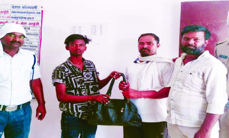 जानकारी क अनुसार गत नौ जून को महिला राधा का बैग जिसमें सोने-चांदी के जेबर एवं पांच हजार रुपए नगद थे, जो बीटीआई रोड पर ऑटो में छूट गए थे। महिला ने थाने पहुंचकर इस संबंध में शिकायत की। देहात थाना पुलिस द्वारा प्रकरण की गंभीरता को देखते हुए यातायात, चीता मोबाइल आदि सभी प्वाइंटों को उक्त संबंध में सूचना दी गई। लेकिन महिला का बैग ऑटो की सीट के नीचे छिप जाने से ऑटो चालक आकाश शाक्य उसे देख नहीं पाया था। जब मंगलवार को ऑटो को साफ सफाई की तो वह बैग सीट के नीचे मिल गया। बैग मिलने की सूचना तत्काल ऑटो चालक ने लहार चुंगी पर ड्यूटीरत ट्रेफिक जवान को दी। ट्रेफिक जवान ने तत्काल ऑटो चालक को अपने साथ लेकर थाना देहात पहुंचा। थाना देहात पुलिस ने फरियादी महिला को बुलाकर सोने-चांदी के जेवरात कीमत एक लाख रुपए व पांच हजार रुपए नगद मय बैग के सुपुर्द किया गया। इस कार्य में निरीक्षक सुधीर सिंह कुशवाह, यातायात आरक्षक संजय दिनकर, बीडीएस सदस्य मनीष सिंह राजावत, ऑटो चालक आकाश शाक्य निवासी महावीर नगर भिण्ड की महत्वूपर्ण भूमिका रही।