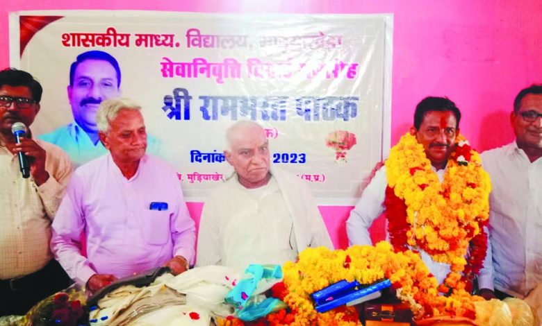 भिण्ड। शासकीय माध्यमिक विद्यालय मुडियाखेडा में पदस्थ शिक्षक रामभरत पाठक शुक्रवार को सेवानिवृत्त हो गए। उनके सम्मान में स्कूल प्रबंधन द्वारा विदाई समारोह का आयोजन किया गया। इस अवसर पर मुख्य रूप से मंच पर वरिष्ठ समाजसेवी राजेश शर्मा, पूर्व एडीआई रमेशबाबू शर्मा, केजी शर्मा और बीएसी सत्यपाल जादौन मौजूद रहे।