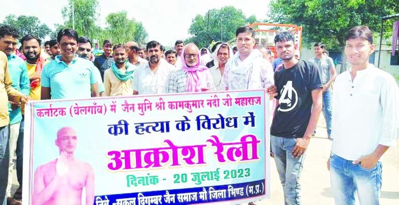 मौ। कर्नाटक के बेलगांव में हुई जैन मुनि काम कुमारनंदी महाराज की हत्या के विरोध में गुरुवार मौ जैन समाज ने राष्ट्रपति एवं कर्नाटक के मुख्यमंत्री के नाम तहसीलदार को ज्ञापन सौंपा और सकल जैन समाज के लोगों ने सुबह नौ बजे से 11 बजे तक अपने प्रतिष्ठान बंद करके विरोध जताया। इस अवसर पर राकेश जैन, अशोक जैन, दिनेश जैन, जिनेन्द्र जैन, जयकुमार जैन, देवेन्द्र जैन, शैलेश जैन, प्रदीप जैन छेकुरी, सजल जैन, आगम जैन, अमित जैन, सोनू, गौरव जैन एवं सकल जैन समाज के लोग उपस्थित रहे।