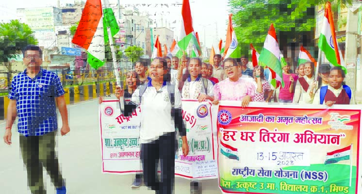 भिण्ड। आजादी के अमृत महोत्सव के तहत हर घर तिरंगा अभियान के अंतर्गत रविवार को सुबह आठ बजे शा. उत्कृष्ट विद्यालय क्र.एक की राष्ट्रीय सेवा योजना इकाई द्वारा विद्यालय से परेड चौराहे तक तिरंगा रैली निकाली गई। प्राचार्य पीएस चौहान के निर्देशन और रासेयो अधिकारी डॉ. धीरज सिंह गुर्जर के मार्गदर्शन में आयोजित रैली को हरी झण्डी सेना के रिटायर्ड नायक रमेशचन्द्र दुबे ने दिखाई।