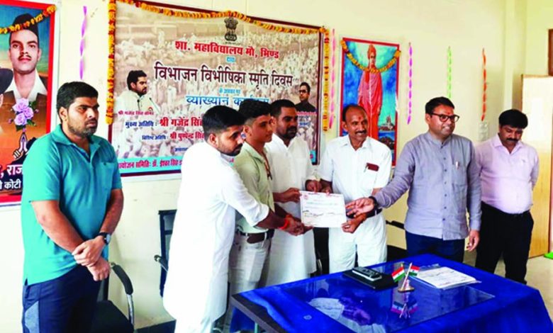 मौ। शा. महाविद्यालय मौ में आजादी का अमृत महोत्सव के अंतर्गत सोमवार को विभाजन विभीषिका स्मृति दिवस मनाया गया। इस अवसर पर मुख्य अतिथि के रूप में उपस्थित राज्य युवा सलाहकार परिषद मप्र शासन के सदस्य गजेन्द्र सिंह तोमर ने कहा कि विभाजन की विभीषिका को भुलाया नहीं जा सकता। 15 अगस्त को हम स्वतंत्रता और स्वाधीनता का अर्थ समझते हैं, किंतु हमें किन परिस्थितियों में स्वतंत्रता मिली यह भी समझना आवश्यक है। 14 अगस्त को भारत के डेढ़ करोड़ नागरिक विस्थापित हुए थे, साथ ही 10 लाख लोगों का बलिदान हुआ था, इसलिए यह दिन उन सभी आत्माओं को श्रृद्धांजलि अर्पित करने का है।
