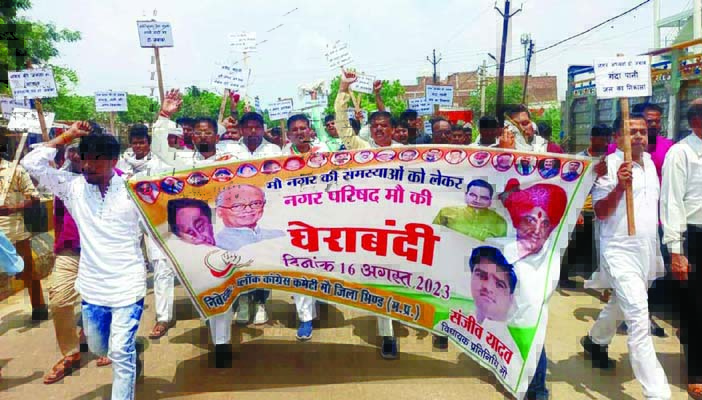 मौ। नगर की जन समस्याओं को लेकर में कांग्रेस कार्यकर्ताओं ने बुधवार को रैली निकालकर नगर परिषद क घेराव कर कलेक्टर के नाम तहसीलदार मौ को ज्ञापन सौंपा।