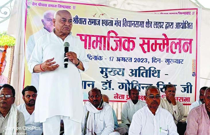 लहार। सेन-श्रीवास समाज एकता मंच विधानसभा क्षेत्र लहार द्वारा मंगलम गार्डन लहार में सामाजिक सम्मेलन आयोजित किया गया। जिसमें मुख्य अतिथि के रूप में मप्र विधानसभा के नेता प्रतिपक्ष डॉ. गोविन्द सिंह शामिल हुए।