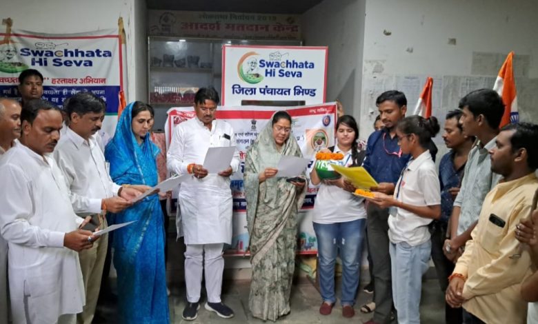 भिण्ड 13 सितम्बर 2023/युवा कार्यक्रम एवं खेल मंत्रालय, भारत सरकार नेहरू युवा केंद्र संगठन जिला भिण्ड एवं जिला प्रशासन के सहयोग से मेरी माटी मेरा देश अभियान के अंतर्गत आज जिला पंचायत कार्यालय भिण्ड में सांसद संध्या सुमन राय, विधायक संजीव सिंह कुशवाह, जिला पंचायत अध्यक्ष कामना सिंह भदौरिया, कलेक्टर संजीव श्रीवास्तव, सीईओ जिला पंचायत मनोज सरियाम, ने शपथ ली और उपस्थित लोगो को शपथ दिलाई।