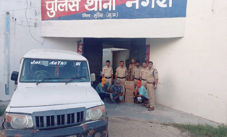 रुपये पुलिस अधीक्षक महोदय शैलेंद्र सिंह चौहान द्वारा सम्पूर्ण जिले में आगामी विधानसभा चुनाव के मद्देनजर अवैध रूप से परिवहन की जा रही शराब व शराब तस्करों को पकड़ने हेतु विषेश अभियान चलाया जा रहा है। जिसके अंतर्गत अति पुलिस अधीक्षक अरविन्द ठाकुर के निर्देशन में एस.डी.ओ.पी अम्बाह रवि अदौरिया के मार्गदर्शन में चलाये जा रहे अवैध शराब परिवहन एवं अवैध बिक्री करने वालों के विरुद्ध विशेष अभियान चलाया जा रहा है, इसी तारतम्य में सोशल मीडिया पर वायरल हो रहे वीडियो जिसमे बोलेरो गाड़ी क्र० एम.पी. 04 बी.ए. 9011 से अवैध रूप से भरी हुई शराब की गाड़ी जो कि थाना क्षेत्रांतर्गत ग्राम धोर्रा के तिराहे पर बिक्री हेतु गाँव में शराब की पेटियाँ उतार रही थी। उक्त वीडियों के संदर्भ में भी सख्त से सख्त कार्यवाही करने हेतु पुलिस अधीक्षक महोदय द्वारा मुझे थाना प्रभारी थाना नगरा को विशेष निर्देश दिये गये थे, जिसके पालन में मुझ थाना प्रभारी नजारा द्वारा थाने पर तीन अलग-अलग टीम बनाकर क्षेत्र में अवैध शराब पर कार्यवाही करने हेतु रवाना किया गया था जिसमे ग्राम धोर्रा से उक्त वीडियो में अवैध रूप से बिक्री करने हेतु उतारी गई शराब के संदर्भ में ग्राम धोरों के एक आरोपी को पुलिस हिरासत में लेकर उसके घर के बाहर बनी गुमटी से 10 पेटी देशी मदिरा- प्लेन के जप्त की जा कर रवाना होकर ग्राम खेरली से उक्त शराब परिवहन करने वाली बोलेरो वाहन को भी मय आरोपी के विधिवत जप्त किया गया । साथ ही ग्राम खेरला से 2 पेटी मदिरा प्लेन के खेरली तिराहे पर स्थित गुमटी से एक अन्य आरोपी से जप्त की. जाकर कार्यवाही की गई, साथ ही रवाना होकर ग्राम मान्धाता का पूरा पर स्थित ढोलू मोलू ढाबा के मालिक से 2 पेटी बीयर की विधिवत जप्त की जा कर मालिक के विरुध्द कार्यवाही की गई कुल संपूर्ण कार्यवाही में 12 पेटी मदिरा प्लेन व 2 पेटी बीयर की कुल प्रकरण 3 जिससे 1 प्रकरण 34 (2) आबकारी एक्ट एवं दो प्रकरण 34 आबकारी एक्ट के अंतर्गत अलग-अलग पंजीबद्ध किये जा कर कार्यवाही की गई।