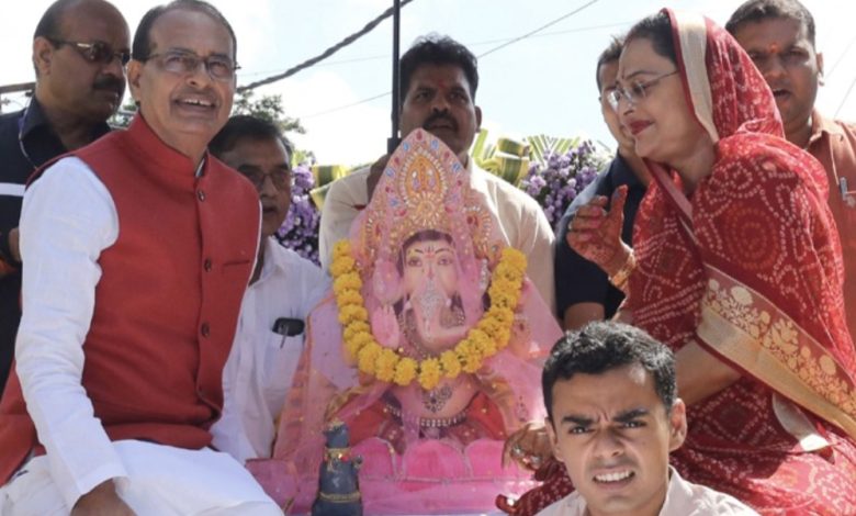 मुख्यमंत्री शिवराज सिंह चौहान ने आज गणेश चतुर्थी के अवसर पर परिवार के साथ भोपाल के प्लेटिनम प्लाजा के पास मूर्तिकार रवि प्रजापति द्वारा निर्मित विघ्नहर्ता गणपति जी की प्रतिमा लाकर निवास में प्रतिष्ठापित की। इस अवसर पर मुख्यमंत्री शिवराज सिंह चौहान की धर्मपत्नी साधना सिंह, पुत्र कार्तिकेय सिंह चौहान उपस्थित थे। मुख्यमंत्री निवास में विधि विधान पूर्वक गणेश जी की प्रतिमा स्थापित की गई। मुख्यमंत्री शिवराज सिंह चौहान ने सपरिवार भगवान गणेश की पूजा अर्चना की।