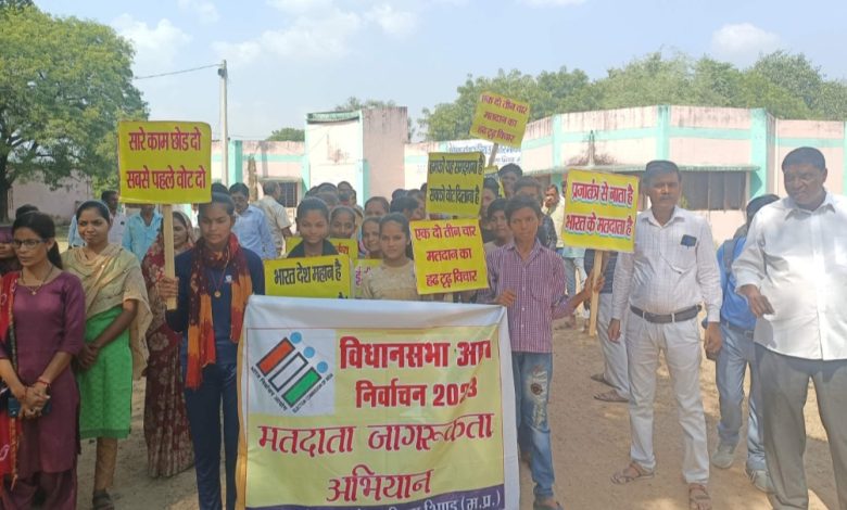 भिण्ड /कलेक्टर एवं जिला निर्वाचन अधिकारी संजीव श्रीवास्तव के निर्देशानुसार विधानसभा निर्वाचन 2023 हेतु स्वीप गतिविधि अंतर्गत महिला बाल विकास विभाग की आंगनबाड़ी कार्यकर्ताओं एवं सहायिकाओं द्वारा परियोजना लहार के ग्राम बरहा एवं भिण्ड अर्बन में मतदाता जागरूकता रैली का आयोजन किया गया।जनजागृक्त बढ़ाने के लिए लोगों को बताया ताकि कोई भी मतदाता मतदान से वंचित न रहे।मतदाताओं को उनके मताधिकार का प्रयोग करने हेतु प्रेरित किया गया। साथ ही विधानसभा निर्वाचन 2023 में शत्-प्रतिशत मतदान करने हेतु मतदाताओं को प्रेरित किया गया कि वे बिना भय, लालच एवं दबाव के स्वतंत्र एवं निष्पक्ष मतदान करें।