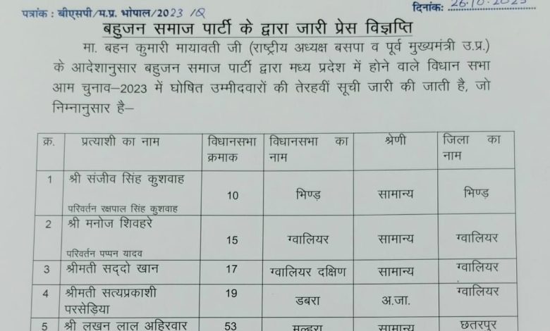 बसपा की 9 प्रत्याशियों की सूची जारी, भिंड से प्रत्याशी बदलते हुए संजीव सिंह को मिला टिकट।