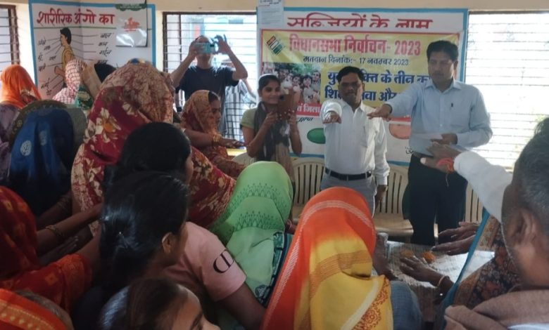 भिण्ड 03 अक्टूबर 2023/कलेक्टर एवं जिला निर्वाचन अधिकारी संजीव श्रीवास्तव के निर्देशानुसार जिला प्रशासन द्वारा चलाए जा रहे मतदाता जागरूकता अभियान अंतर्गत आज ग्राम पंचायत अमलेड़ा में मुख्य कार्यपालन अधिकारी जिला पंचायत भिण्ड मनोज सरियाम ने उपस्थित मतदाताओं से अपील करते हुए कहा कि दीपावली में पहले दीपदान फिर मतदान आवश्यक रूप से करें।उन्होंने कार्यक्रम में स्व-सहायता समूह की महिलाओं से चर्चा करते हुऐ कहा कि मतदान करना एक संविधानिक पर्व है और सभी को इस पर्व पर बढ़-चढ़ कर भाग लेना चाहिए, विशेषकर युवाओं जो पहली बार मतदान करने वाले हैं और इस बार चुनाव आयोग ने वृद्ध एवं दिव्यांग जनों के लिए वोट डालने हेतु विशेष सुविधा दी गई है। इसलिए सभी लोग अपना मतदान अवश्य करें। कार्यक्रम में आजीविका मिशन से अमृतलाल सिंह डीपीएम, रामेंद्र सिंह, जयवीर सिंह बीएम, सचिव ग्राम पंचायत, बीएलओ, आगनवाड़ी कार्यकर्ता, सहायिका एवं सैकड़ों महिलाएं मौजूद रहीं।