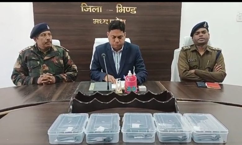 भिंड पुलिस अधीक्षक डॉ असित यादव, अतिरिक्त पुलिस अधीक्षक संजीव पाठक एवं नगर पुलिस अधीक्षक अरुण कुमार उईके के द्वारा अवैध हथियार विक्रय करने वाले बदमाशों पर कार्यवाही हेतु निर्देशित किया गया था। उनके प्राप्त निर्देशन में सिटी कोतवाली प्रभारी निरीक्षक प्रवीण सिंह चौहान के द्वारा टीम बनाई गई जिसके द्वारा दो आरोपियों को अवैध पिस्टल विक्रय करते हेतु गिरफ्तार किया गया, जिनके कब्जे से पांच पिस्टल व दो जिन्दा राउण्ड एवं एक अपाचे मोटरसाइकिल जप्त कर आरोपीगणों को गिरफ्तार किया गया।