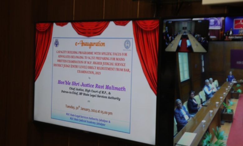 मध्य प्रदेश उच्च न्यायालय के मुख्य न्यायाधीश द्वारा लगातार तीसरे प्रो-बोनो क्षमता निर्माण कार्यक्रम का उद्घाटन किया गया। मध्य प्रदेश उच्च न्यायालय न्यायिक सेवा परीक्षाओं की कठोर चुनौतियों का सामना करने वाले अनुसूचित जाति/अनुसूचित जनजाति, अल्पसंख्यकों, महिलाओं, आर्थिक रूप से कमजोर वर्ग और अन्य वंचित वर्ग के उम्मीदवारों के लिए प्रो-बोनो प्रशिक्षण सत्र शुरू करने वाला देश का पहला राज्य बन गया है। 30 जनवरी, 2024 को न्यायमूर्ति रवि मलिमथ, मुख्य न्यायाधीश, मध्य प्रदेश उच्च न्यायालय एवं संरक्षक-प्रमुख, म.प्र. राज्य विधिक सेवा प्राधिकरण, जबलपुर ने एमपी की मुख्य लिखित परीक्षा की तैयारी करने वाले अभ्यर्थियों के लिए क्षमता निर्माण कार्यक्रम का उद्घाटन किया।