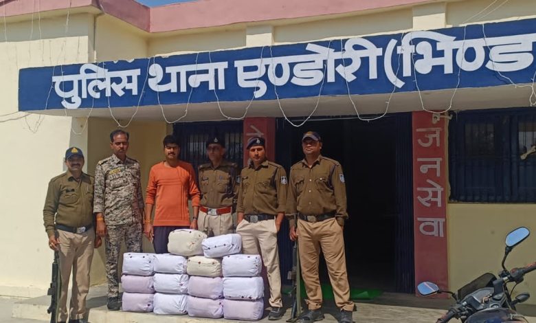इसी तारतम्य में प्रभारी अनुविभागीय अधिकारी गोहद दीपक तोमर के मार्गदर्शन में थाना प्रभारी एण्डोरी उपनिरीक्षक परशुराम अहिरवार को दिनांक 29.02.2024 को मुखविर द्वारा सूचना प्राप्त हुयी कि थाना क्षेत्रान्तर्गत बाराहेट से भोनपुरा रोड पर एक सफेद रंग की स्पिट डिजायर कार खडी है जिसमें गाँजा भरा हुआ है तथा तीन सर्दिग्ध व्यक्ति बैठे है। उक्त सूचना के सम्बन्ध में वरिष्ठ अधिकारियों को सूचित किया गया। प्राप्त निर्देशों के पालन में थाना प्रभारी एण्डोरी द्वारा स्थान बाराहेट भोनपुरा रोड आसन नदी के पुल से पहले पहुंचे तो एक सफेद रंग की कार दिखी पुलिस टीम द्वारा उक्त कार की घेराबन्दी की गई तो पुलिस टीम को देखकर कार में बैठ सदिग्ध व्यक्ति भागने लगे तो पुलिस टीम द्वारा तीनो लोगो का पीछा कर पकड लिया गया तथा कार कं० HR55AM8681 की तलाशी लेने पर उक्त कार में से 14 पेकिट मिलें जिसे खोलकर देखा तो उक्त पैकिट के अन्दर गाँजा भरा हुआ था जिसका कुल बजन 76 किलो 742 ग्राम को बरामद किया गया उक्त घटना के सम्बन्ध में आरोपियों को गिर० कर अवैध मादक पदार्थ (गाँजा) जप्त किया जाकर थाना एण्डोरी में अपराध क० 25/24 धारा 8/20 एनडीपीएस एक्ट के तहत अपराध पंजीबद्ध कर नियमानुसार विवेचना में लिया गया।