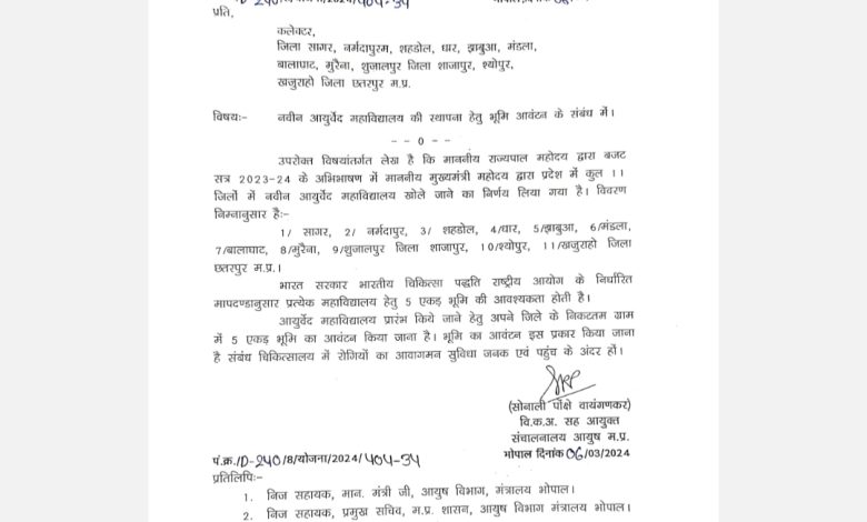 राज्यपाल महोदय द्वारा बजट सत्र 2023-24 के अभिभाषण में माननीय मुख्यमंत्री द्वारा प्रदेश में कुल 11 जिलों में नवीन आयुर्वेद महाविद्यालय खोले जाने का निर्णय लिया गया है |भारत सरकार भारतीय चिकित्सा पद्धति राष्ट्रीय आयोग के निर्धारित मापदण्डानुसार प्रत्येक महाविद्यालय हेतु भूमि की आवश्यकता होती है। आयुर्वेद महाविद्यालय प्रारंभ किये जाने हेतु अपने जिले के निकटतम ग्राम में 5 एकड़ भूमि का आवंटन किया जाना है । यह महाविद्यालय सागर, नर्मदापुर, शहडोल,धार, झाबुआ, मंडला, बालाघाट, मुरैना, शुजालपुर, शाजापुर, श्योपुर, खिजुराहो, छतरपुर म.प्र. में खुलेंगे। नेशनल इंटीग्रेटेड मेडिकल एसोसिएशन के प्रदेश अध्यक्ष डॉ हरेंद्र सिंह भदौरिया के अनुसार 11 नवीन महाविद्यालय का खुलना प्रदेश सरकार का सराहनीय कार्य है जिससे अधिक संख्या में विद्यार्थी शिक्षा प्राप्त कर आयुर्वेद चिकित्सा पद्धति द्वारा चिकित्सा कर सकेंगे एवं लोगो का आयुर्वेद के प्रति रूझान बढ़ेगा। उनके अनुसार पूर्व से जो आयुर्वेद महाविद्यालय प्रदेश भर में संचालित है उनकी कमियों को सुधारना एवं विद्यार्थियों की महाविद्यालय एंव विश्वविद्यालय स्तर पर समस्या का हल करना भी अत्यंत आवश्यक है । जिन छात्रों की डिग्री पूर्ण हो चुकी है उनके रोजगार हेतु हर साल नई नियुक्तियां की जाए ।
